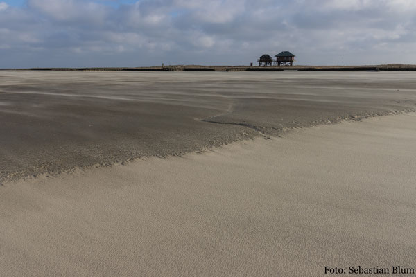Dieser Wandel scheint sich nun fortzusetzen, denn alleine jetzt im April konnte ich drei Mal dabei zusehen, wie unter dem Einfluss von Nordwestwinden der nordöstlichste Zipfel des Norderoogsandes sichtbar um mehrere Meter nach Osten wanderte. Zwar scheinen dies „nur“ starke Sandverwehungen gewesen zu sein, die ein dauerhaftes Liegenbleiben auf den neu errungenen Flächen erstmal nicht ermöglichten, aber was sich dann letzte Woche Donnerstag ereignete, zeigt, wie schnell es auf einmal gehen kann, wenn der Grundstein erstmal gelegt ist: Wieder sorgte starker Wind aus Nordwest dafür, dass über mehrere Stunden Sandverwehungen über das Watt im Norden der Hallig fegten – diesmal allerdings so intensiv und ausgeprägt, dass auch nach etlichen Tiden dem Watt nach wie vor Sand aufliegt und dieser insbesondere in den nordwestlichen Lahnungsfeldern seine Spuren hinterlassen hat. Wie nach Schneeverwehungen hat sich dort nun der Sand festgesetzt und teilweise die kompletten äußeren Lahnungsfelder zugesandet. Auch der „Hauspriel“, der vom Rummelloch (ein großer Priel zwischen Hooge / Norderoog und Pellworm) Richtung Norderoog führt und ohnehin schon sehr flach war, ist nun auf den ersten 200 m nördlich der Hallig nochmals flacher geworden.