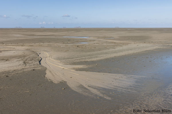 Kam es mir schon bei den ersten beiden „Wander-Ereignissen“ des Sandes so vor, als könne ich meinen Augen nicht mehr trauen, dachte ich das diesmal erst recht und war wirklich sprachlos, als ich letzten Donnerstag auf Höhe des Anlegers auf einer zentimetertiefen Sandschicht lief, wo ich normalerweise im Schlick feststecke. So viel Sand wie zum Zeitpunkt des Tathergangs liegt zumindest großflächig nicht mehr auf dem Watt, dennoch ist eine Veränderung gerade der Wattoberfläche nach wie vor zu erkennen – und in den Lahnungsfeldern werden diese Veränderungen noch viel länger zu sehen sein.