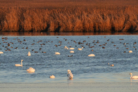 Die melodischen Stimmen der Zwergschwäne klingen weit über den nordfriesischen Hauke-Haien-Koog hinaus. Die seltenen Zugvögel sind gerade aus der russischen Tundra bei uns eingetroffen. Ihr Gesang verleiht der Dämmerung eine einzigartige Atmosphäre und ist ein ganz besonderes Naturschauspiel. Mehr als 1.300 Vögel dieser bedrohten Art halten sich derzeit auf den Gewässern im Vogelschutzgebiet auf und können bei naturkundlichen Führungen des Vereins Jordsand ab Schlüttsiel bestaunt werden.