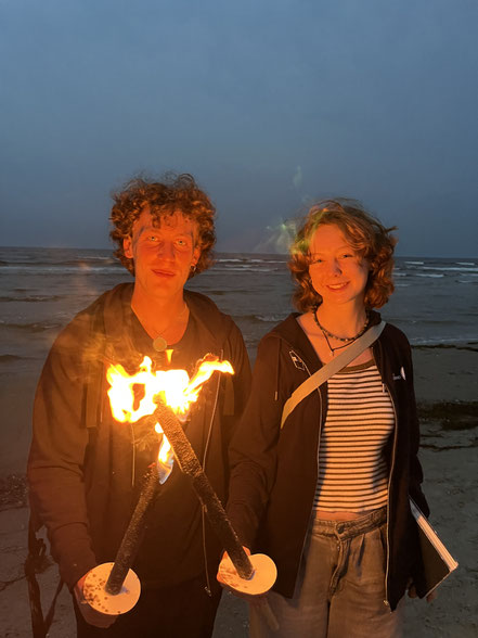 Lina Wegener (FÖJ) mit Praktikant Edgar Geipel bei der Fackelwanderung (v. r. n. l.).